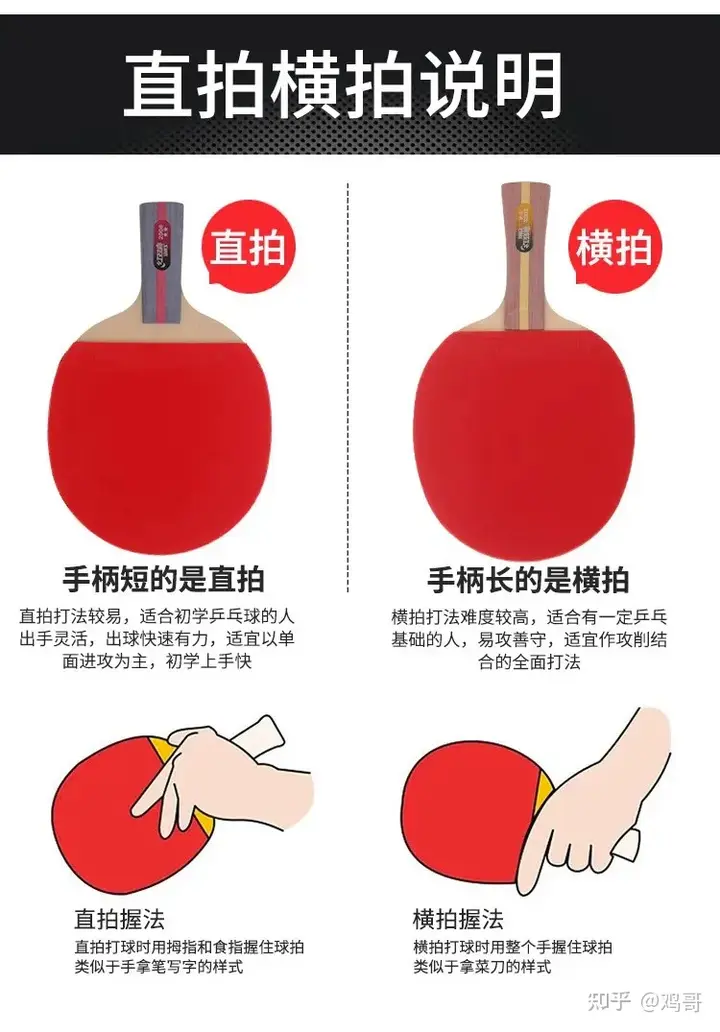 横拍:拍柄较长,握法类似于棍子,发力足、处理中远台的球有优势,处理台内球不如直拍灵活。(英文名"shakehand")