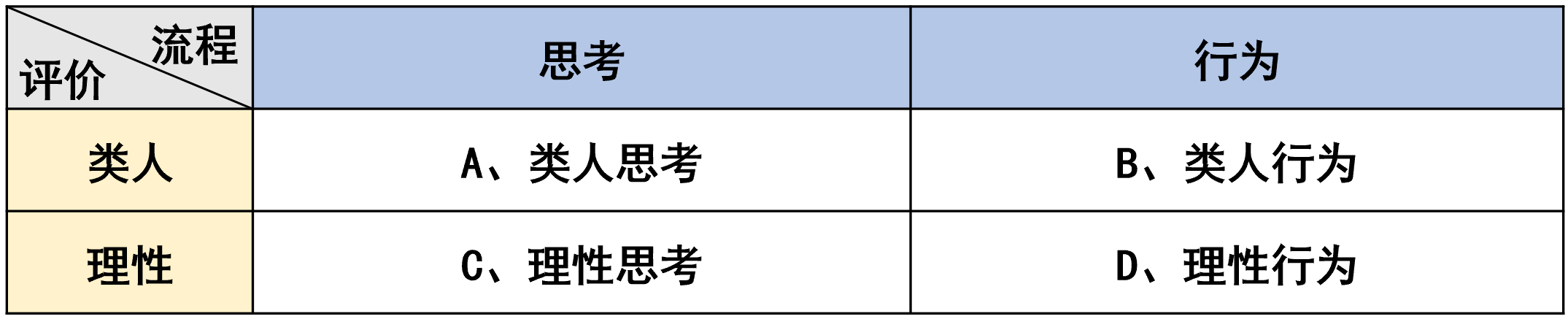 总体来说,评价一个人是否智慧,主要是评价这个人的行动。而支持行动的一个重要因素就是“思考”的过程(除此之外,还需要有一些不假思索的反应,例如生物中的“缩手反射”等)。人工智能的研究对象叫做“智能体”,即能够采取行动的东西。人工智能的研究可以从两个维度来分类,即关注这个智能体做事流程的哪一部分(是内在的思考?还是外在的行动?);以及我们如何评价智能体做出的行动。下面的表格列举了历史上这两个维度下的研究主题,这些领域之间研究人员相互鄙视,但也在相互促进: